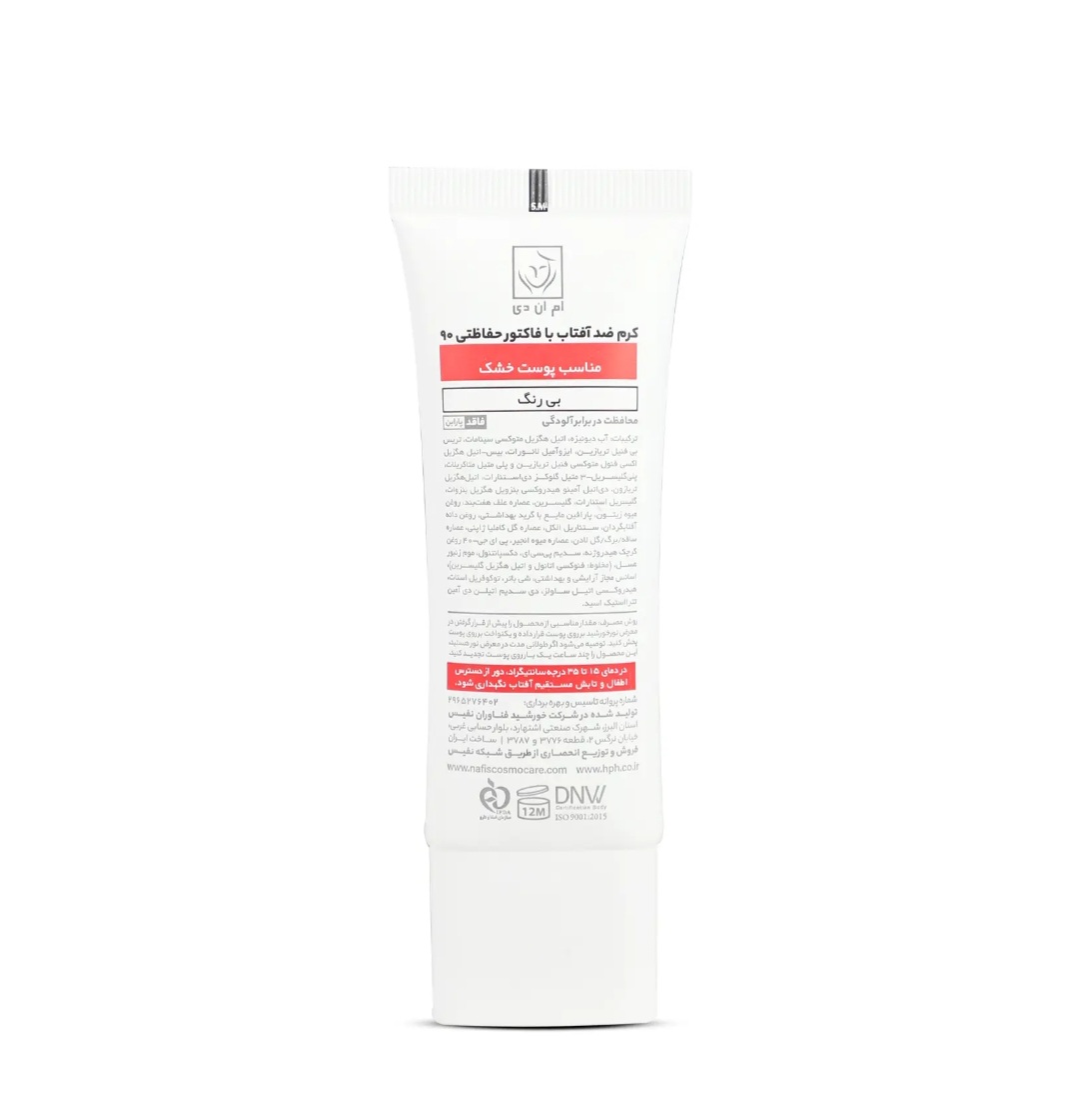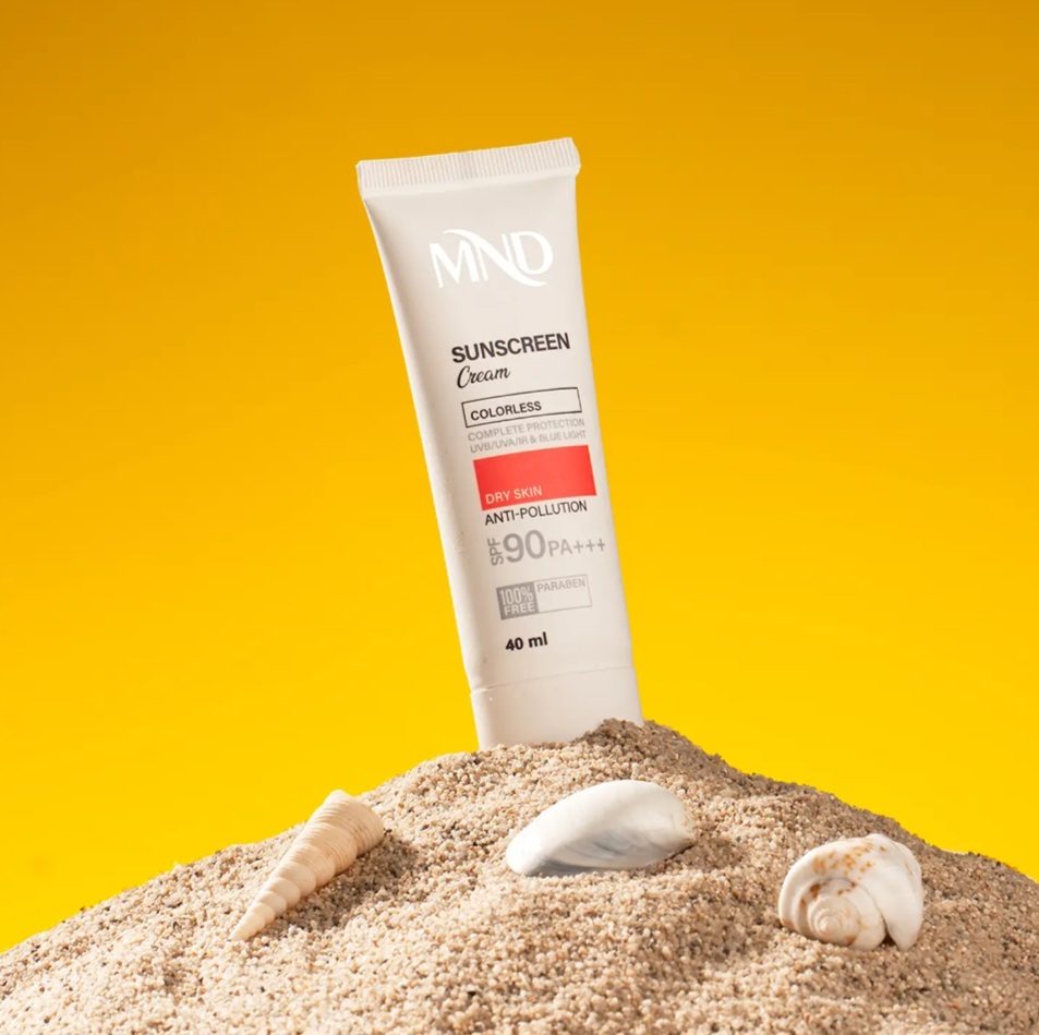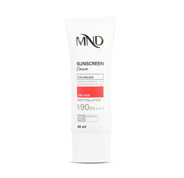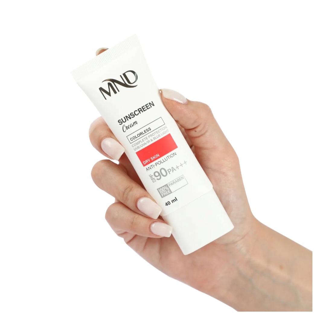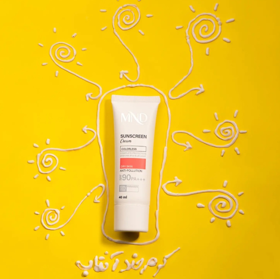 تابش طولانی مدت نور خورشید به پوست، یکی از عوامل پیری زودرس پوست است. در اصل اشعههای UVA و UVB خورشید با ایجاد رادیکالهای آزاد در پوست، موجب آسیب دیدن ساختارهای حیاتی پوست شده و ایجاد لک و چین و چروک را تسریع میکنند. همچنین تحقیقات علمی اخیر نشان دادهاند که طیف مادون قرمز ساطع شده از خورشید و نور آبی منتشر شده از لوازم الکترونیکی (رایانه، گوشی همراه، ...) هم در آسیب دیدن پوست نقش دارند، درنتیجه برای تولید یک محصول ضدآفتاب کامل، مقابله با این اشعهها نیز باید مورد توجه قرار بگیرد. این کرم ضدآفتاب MND با فاکتور حفاظتی 90، بهصورت فاقد پارابن، بیرنگ و مناسب برای پوست خشک تولید شده و با بهرهگیری از ترکیبات و فیلترهای مناسب قادر است مانع صدمه دیدن پوست توسط اشعههای فوقالذکر شود.