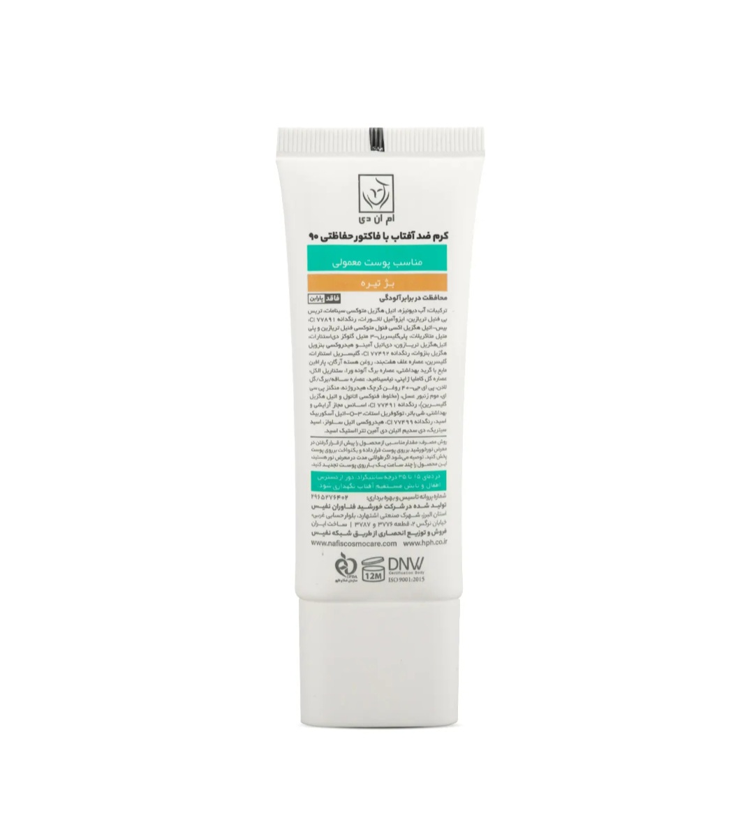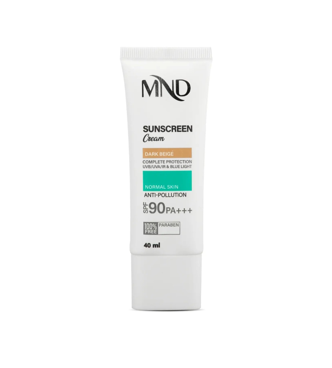 تابش طولانی مدت نور خورشید به پوست، یکی از عوامل پیری زودرس پوست است. در اصل اشعههای UVA و UVB خورشید با ایجاد رادیکالهای آزاد در پوست، موجب آسیب دیدن ساختارهای حیاتی پوست شده و ایجاد لک و چین و چروک را تسریع میکنند. همچنین تحقیقات علمی اخیر نشان دادهاند که طیف مادون قرمز ساطع شده از خورشید و نور آبی منتشر شده از لوازم الکترونیکی (رایانه، گوشی همراه، ...) هم در آسیب دیدن پوست نقش دارند، درنتیجه برای تولید یک محصول ضدآفتاب کامل، مقابله با این اشعهها نیز باید مورد توجه قرار بگیرد. کرم ضدآفتاب SPF 90 ام ان دی بهصورت فاقد پارابن، به رنگ بژ تیره و مناسب برای پوست معمولی تولید شده و با بهرهگیری از ترکیبات و فیلترهای مناسب قادر است مانع صدمه دیدن پوست توسط اشعههای فوقالذکر شود.