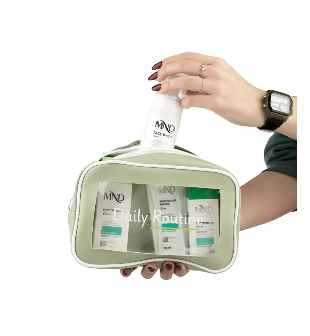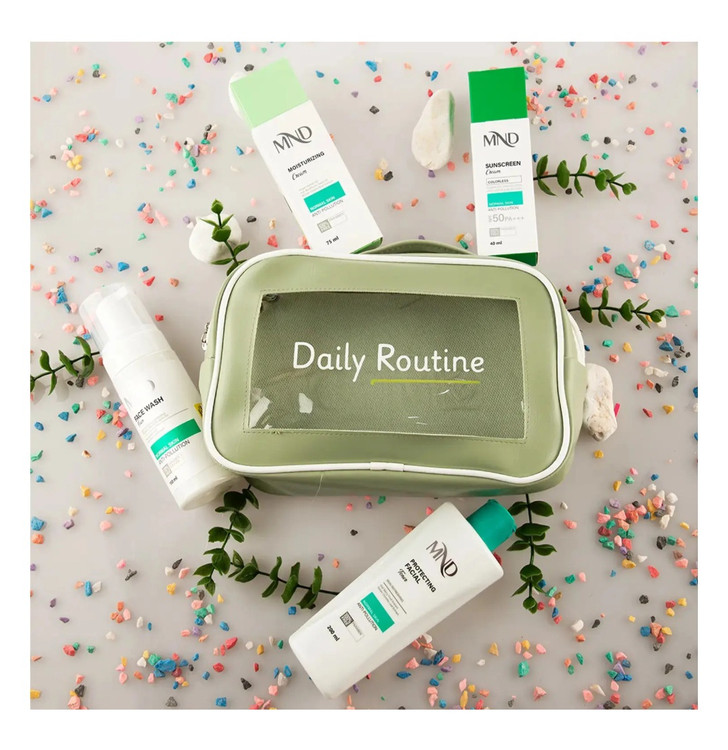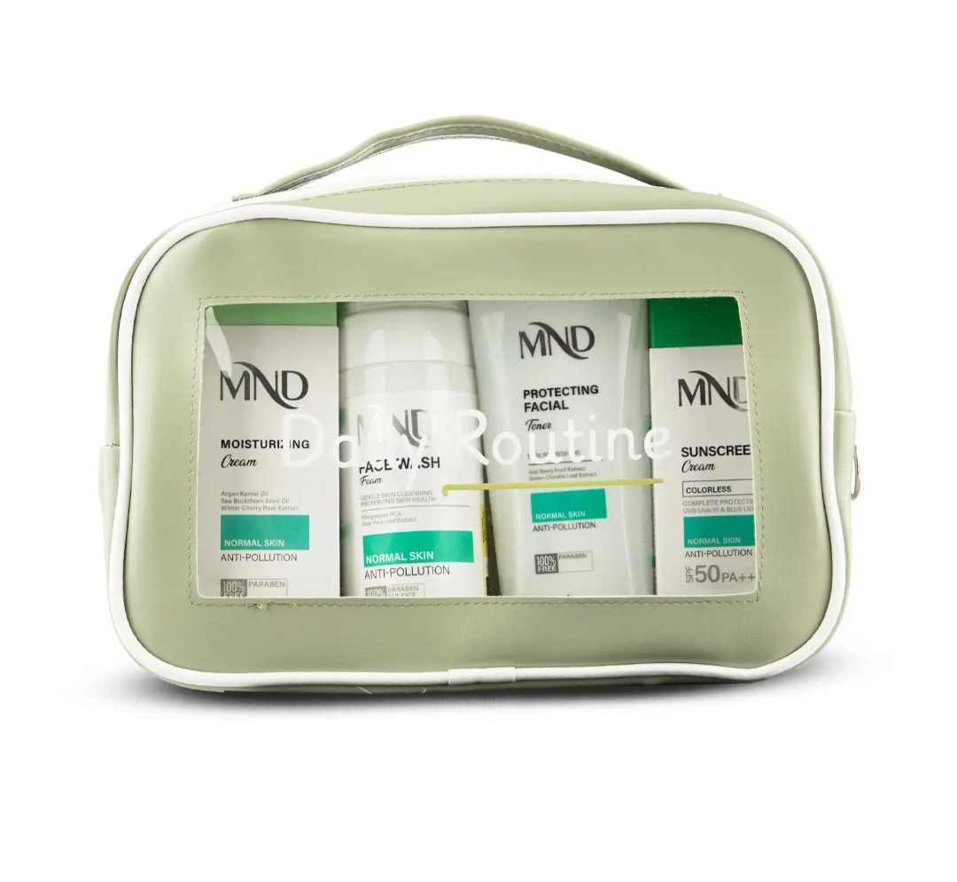 این پک مراقبت روزانه MND مناسب پوستهای معمولی بوده و شامل فوم شستشو، تونر صورت محافظت کننده، کرم مرطوب کننده و کرم ضدآفتاب است.